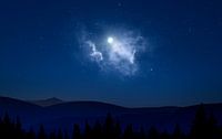 Dit landschap is gecreëerd met photoshop. De basis is een foto overdag en via diverse technieken zijn er onder andere wolken, sterren, bomen en een maan aan toegevoegd. Er is dus een fantasie nachtlandschap van gemaakt.