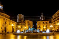 Koop de foto Nachtopname Plaza de la Virgen met Fuente del Turia in Valencia Spanje van Dieter Walther als print op canvas, aluminium dibond, (ingelijste) fotoprint, behang en ArtFrame. Voor jou op maat geprint in Fine-Art kwaliteit.