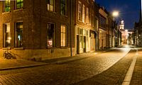 Verstilde foto in het avondlicht van huizen aan de Grotekerksbuurt met geparkeerde fiets en een kerk in Dordrecht in Zuid-Holland in Nederland.