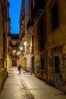 Nacht shot oude stad steeg met eenzame vrouw in Valencia Spanje