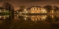 Nachtopname van het kleine Leeuwarder stadsdeel, de EEbuurt, waarin de stroming van het water zichtbaar is door de lange sluitertijd van de opname.