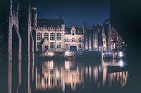 Nachtopname van de Middeleeuwse huisjes nabij het Gravensteen in de stad Gent. De huisjes worden prachtig weerspiegeld in het water.