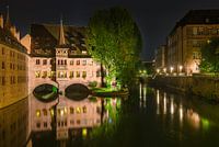Nachtopname van het beroemde Hospice van de Heilige Geest (Heilig Geist Spital) in het historische stadscentrum van Neurenberg, Duitsland