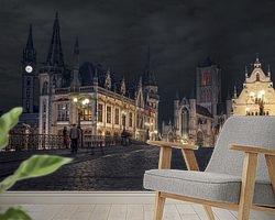 Nachtopname van historisch centrum Gent vanop de Sint-Michielsbrug. Op de foto zie je het voormalige postgebouw met klokkentoren en de gotische Sint-Niklaaskerk.