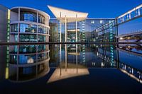 Een nachtelijk panorama dat de moderne architectuur van het Paul Löbe Huis in al zijn pracht laat zien. De heldere ramen en strakke lijnen van het gebouw worden perfect weerspiegeld in het donkere, kalme oppervlak van de Spree, waardoor een symmetrische, bijna surrealistische compositie ontstaat. Het werk vangt de stilte en majesteit van een Berlijnse avond en nodigt de kijker uit om de harmonieuze combinatie van stedelijk ontwerp en natuurlijke reflectie te ervaren.