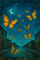 Dit surrealistische olieverfschilderij toont een magisch en dromerig tafereel: een verlaten straat onder een diepe sterrenhemel, waar kleurrijke vlinders in de nacht rondvliegen. De gebouwen ogen stil en verlaten, alsof de tijd is bevroren. Hoog boven de straat verschijnt een glinsterende maan, die een mysterieuze gloed verspreidt en…