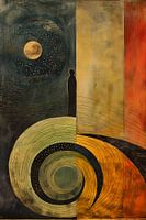 "Nachtwacht der Tijd" toont een silhouet tegen een achtergrond die de tijdloze dans van sterren en planeten uitbeeldt. De grote cirkel beneden kan een zonnewijzer voorstellen, een antiek symbool van vergankelijkheid en kosmische orde. Het werk brengt een stukje eeuwigheid in huis, passend in een ruimte die zowel rust als introspectie ademt.