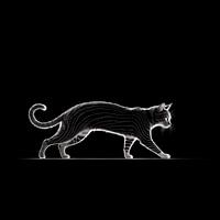 Deze dynamische weergave van een kat in beweging benadrukt de vloeiende en gestileerde vormen, geaccentueerd door het gebruik van sterk licht tegen een donkere achtergrond. De illustratie vangt de essentie van de kat's beweging en krachtige houding.