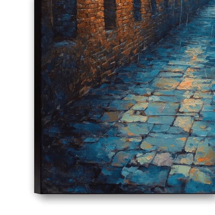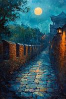 In de mystieke schemering schittert het pad onder een stralende volle maan, terwijl de vochtige lucht het zachte licht van de lantaarns weerkaatst. Historische muren omringen het pad en fluisteren verhalen uit lang vervlogen tijden. Een gevoel van mysterie en verwachting hangt in de lucht, terwijl de horizon glinstert in zachte blauwtinten en een vleugje magie.