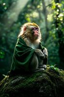 Een peinzende aap zit midden in een dicht, mysterieus bos, gewikkeld in een zachte, groene doek. De mystieke lichtsfeer en vredige houding geven deze foto een ontspannen uitstraling. Het is ideaal voor de woonkamer en creëert een perfecte balans tussen de nabijheid van de natuur en stijlvolle flair. Een oase van rust voor elke kamer.
