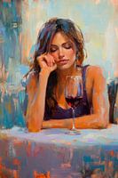 Ondergedompeld in een spel van zachte kleuren en gedachten glijdt de blik van de vrouw over een elegant glas rode wijn. Haar peinzende houding en de zachte glans in haar ogen beloven verhalen van verlangen en ontspanning. Om haar heen vormen de kleuren een harmonieuze achtergrond die de stemming van stille reflectie onderstreept.