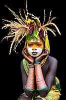 Dit portret toont Nadigu, een jong meisje uit de Suri-stam in de Omo vallei in Ethiopië. Haar gezicht is beschilderd met natuurlijke pigmenten, een vorm van expressie die diep geworteld is in de cultuur van de Suri. De bladeren, bloemen en grassen die haar hoofd sieren, zijn zorgvuldig gekozen en vorm een tijdelijke, levendige…