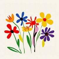 Dit ontwerp weerspiegelt de mid-century moderne esthetiek met levendige, abstracte bloemenuitsnijdingen geïnspireerd door Matisse. Knalrode, gele, blauwe, oranje en paarse bloemen worden gecombineerd met levendige groene stelen en bladeren, allemaal op een strakke witte achtergrond. De minimalistische vormen en speelse lay-out roepen een gevoel van vreugde en creativiteit op en combineren eenvoud met felle kleurcontrasten. Perfect voor een eigentijdse inrichting of mode, het ontwerp straalt charme, energie en artistieke expressie uit in een grillige maar verfijnde stijl.