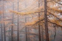Prachtig gekleurde larix bomen in de herst en dichte mist.
