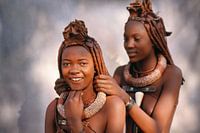 Namibië, bij Opuwo. Himba stam. Meisjes arrangeren elkaars haar.