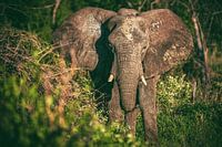 Dit adembenemende beeld vangt de schoonheid en kracht van een van de meest iconische dieren van Afrika - de olifant. Op de voorgrond zie je de majestueuze olifant met zijn gerimpelde huid en lange slagtanden, hoog oprijzend tegen de achtergrond van de Namibische wildernis. De intelligente ogen en expressieve gelaatstrekken van de olifant geven de complexiteit en diepte van zijn gevoelsleven aan. Op de achtergrond zie je de dichte struiken en schaarse vegetatie van de Etosha Pan, een herinnering aan de harde omgeving waarin deze prachtige dieren moeten overleven.