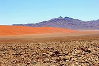 Een surrealistisch en desolaat landschap met paarse bergen en oranje zandduinen rondom Sossusvlei (Sossus Vlei), Namibië, Afrika. Op de voorgrond een ruige vlakte met rotsen. Kleurrijke duinen en bergen in een droog en bar woestijnklimaat waar helemaal niets groeit.