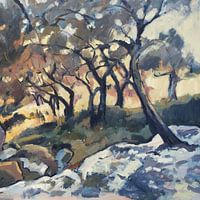 Detail uit het origineel door Nop Briex. olijfgaard aan het Marmari Strand in Loggos, Paxos, Griekenland.
