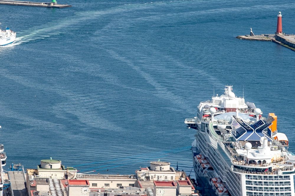 In de haven van Napels liggen vaak enorme cruiseschepen voor anker.