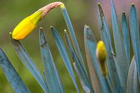 Deze foto toont een enkele, heldergele narcisbloem die zachtjes naar beneden buigt. De bloem is nog niet helemaal open en de tere bloemblaadjes lijken bijna doorschijnend in het zachte licht. De narcis wordt omringd door lange, slanke, blauwgroene bladeren, die een beetje vaag zijn op de achtergrond. Een andere, nog gesloten knop van de…