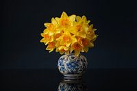 Eenvoudig stilleven met volle bos bloeiende narcissen in een delfts blauwe vaas van de Porceleyne fles