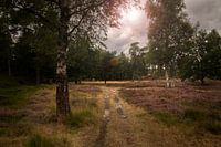 Bloeiende heide tijdens een bewolkte dag met af een toe wat zon, bij De Boswachterij Dwingeloo. Dit is een gebied van circa 1800 hectare in eigendom van Staatsbosbeheer. De boswachterij Dwingeloo maakt deel uit van het Nederlandse Nationaal Park Dwingelderveld. Het bos werd in het begin van de 20e eeuw aangelegd om zandverstuivingen tegen te gaan.