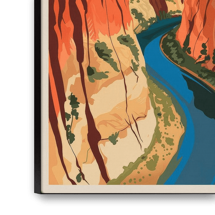 Een indrukwekkend samenspel van warme rode en diepblauwe kleuren voert de kijker mee naar het majestueuze landschap van Big Bend National Park. De zachte rondingen van de rivier harmoniëren perfect met de ruige rotsen en het uitgestrekte heuvellandschap. Dit kunstwerk voegt een uitnodigende en avontuurlijke sfeer toe aan elke woonkamer.