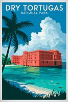 Een turquoise gekleurd paradijs ontvouwt zich voor een indrukwekkend, felrood fort, omringd door zachte golven en schaduwrijke palmbomen. De helderblauwe lucht en het schilderachtige kustlandschap nodigen je uit om te dromen. Dit kunstwerk past perfect in de woonkamer om reislust en een ontspannen vakantiestemming op te roepen.