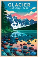 Een prachtige zonsondergang boven Glacier National Park ontvouwt zijn kleurrijke pracht over de glinsterende meren en majestueuze bergen. De zachte golven weerspiegelen het kleurenspel, terwijl de kleurrijke stenen op de voorgrond voor levendige accenten zorgen. Dit kunstwerk zou perfect staan in een woonkamer en tegelijkertijd rust en nabijheid tot de natuur uitstralen.