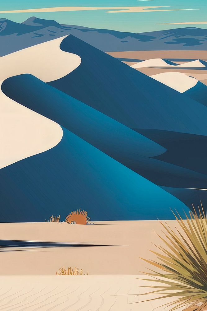 Zachte zandduinen strekken zich harmonieus uit over het landschap, terwijl een helderblauwe lucht het landschap verlevendigt. Groene plantenaccenten zorgen voor een levendig contrast met het minimalistische zandoppervlak. Dit kunstwerk staat perfect in de woonkamer, waar het rust en inspiratie biedt voor ontspannende momenten.