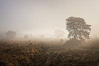 Er hangt een mysterieuze sfeer over het heidegebied van Nationaal Park de Groote Peel bij de deze zonsopkomst met tegenlicht.