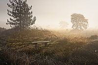Er hangt een mysterieuze sfeer over het heidegebied van Nationaal Park de Groote Peel bij de deze zonsopkomst met tegenlicht.