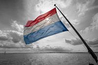 Varend op het IJsselmeer wappert de nationale driekleur in de wind achterop de klipper Sanne Sophia. Dit werk is ook beschikbaar in kleur.