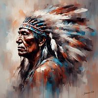 Een Indiaanse man is afgebeeld in profiel, met een traditionele hoofdtooi met lange veren. Rijke texturen en een dynamisch spel van licht en schaduw geven diepte aan zijn verweerde gelaatstrekken en de ingewikkelde details van de hoofdtooi.