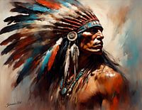 Een trotse Indiaanse man is afgebeeld met een opvallende hoofdtooi met lange veren. Hij is afgebeeld in profiel met gedetailleerde gelaatstrekken die waardigheid en vastberadenheid uitdrukken.