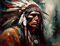 Een Indiaanse man is afgebeeld met een plechtige uitdrukking, getooid in traditionele kleding waaronder een gevederde hoofdtooi. Het gebruik van levendige kleuren en dynamische penseelstreken geeft de afbeelding een krachtig en suggestief gevoel.