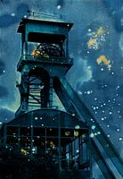 Natte cyanotypie van een schachtbok op de mijnsite Terhills in Eisden (Maasmechelen). De cyanotypie is gemaakt met een digitaal negaties en kurkumapoeder, zout en azijn. De cyanotypie is vervolgens weer digitaal gecombineerd met het oorspronkelijke zwartwitbeeld.