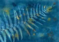 Natte abstracte cyanotypie van een varenblad. Bij dit werk is gebruik gemaakt van een dubbele afdruk met behulp van cyanotypie om meer details in het blad zelf te bekomen.