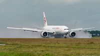 Een gelande China Cargo Airlines Boeing 777-F blaast met de thrust reversers de Polderbaan van luchthaven Schiphol weer wat droger na een flinke regenbui.