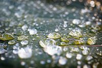 Deze druppels op een blad lijken wel groene schildpadjes in een rij die samenkomen om ergens heen te gaan. De reflectie in het water toont de vergrote nerven van het blad, zodat er een soort tekening in de druppel komt.