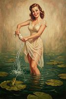 Een charmant, nostalgisch tafereel in vintage stijl toont een glimlachende vrouw die in een vijver staat tussen waterlelies. Terwijl ze haar jurk optilt en water laat stromen, richt een kikker op een lelieblad een speelse waterstraal naar haar. De warme schilderachtige tonen en het klassieke pin-up gevoel roepen een luchtige, humorvolle…