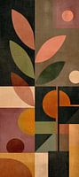 Natural Geometry in Color - Dit is een abstract schilderij met geometrische vormen en botanische elementen, waarin scherpe lijnen en ronde vormen samenkomen in een harmonieus palet van warme, aardse kleuren en een speelse compositie van bladeren en cirkels.