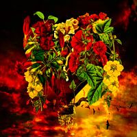 Een hart gemaakt van bloemen, zwevend in de lucht met vogels op de achtergrond. De achtergrond is een mooie warm gekleurde zonsondergang. De kleuren zijn warm rood, oranje, geel en groen.