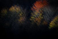 Herfstkleuren tegen een donker bos gemaakt met meervoudige belichting en onderbelichting. Hierdoor lijkt het alsof er vlammen in het bos zijn.
