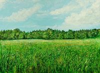 Het schilderij "Natural Wall" toont sterke grassprieten op de voorgrond, die individueel al machtig lijken als pilaren en in hun massa een ondoordringbare eenheid vormen. Deze grassen stralen een zekere strengheid en standvastigheid uit, alsof ze als soldaten in formatie staan opgesteld voor een denkbeeldige muur die wordt gesymboliseerd door de bomenrij op de achtergrond.