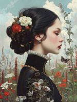 Nature's Graceful Embrace - Dit vrouwen schilderij toont een sereen, zijprofiel van een vrouw verfraaid met rijke, kleurrijke bloemen en fladderende vlinders, tegen een achtergrond van een gedetailleerd botanisch landschap.