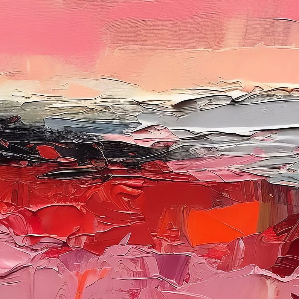 Abstract en expressief landschapsschilderij waarin de kleuren rood, oranje en roze domineren. De compositie is strak, waarbij uitgebreid gebruik gemaakt is van dikke impasto-verf en paletmes accenten.