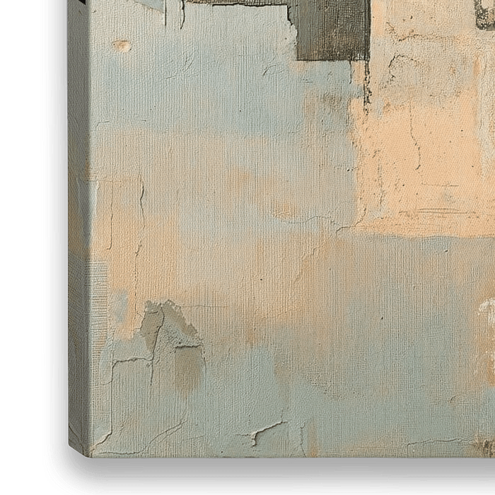 Een abstract kunstwerk met geometrische vlakken van verschillende aardse tinten en maten, die een artistieke compositie vormen.