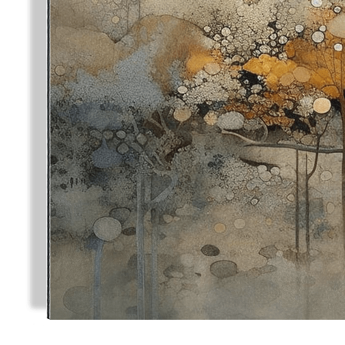 Natuur Abstract Kunst - Dit schilderij ademt natuur met abstracte kwaliteiten, door organische vormen en warme aardetinten te combineren met subtiele kleuraccenten, weerspiegelt het perfect de sereniteit van een mistig boslandschap bij ochtendgloren. De kunstenaar speelt met textuur en diepte, waarbij de verschillende bruin- en…