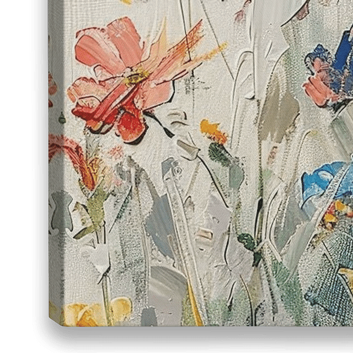 Dit schilderij toont een levendig bloemenveld, rijk aan kleur en textuur, dat een zomerse sfeer oproept.